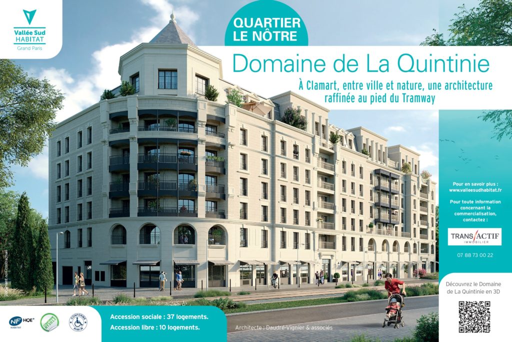 La commercialisation du Domaine de La Quintinie, 37 logements en accession sociale à la propriété et 10 logements en accession libre, débute. Après le succès commercial des Balcons de Normandie, Vallée Sud Habitat propose à la vente, au sein du futur quartier Le Nôtre situé entre ville et nature, une résidence à l’architecture raffinée, au pied du tramway. Pour en savoir plus, cliquez ici.
